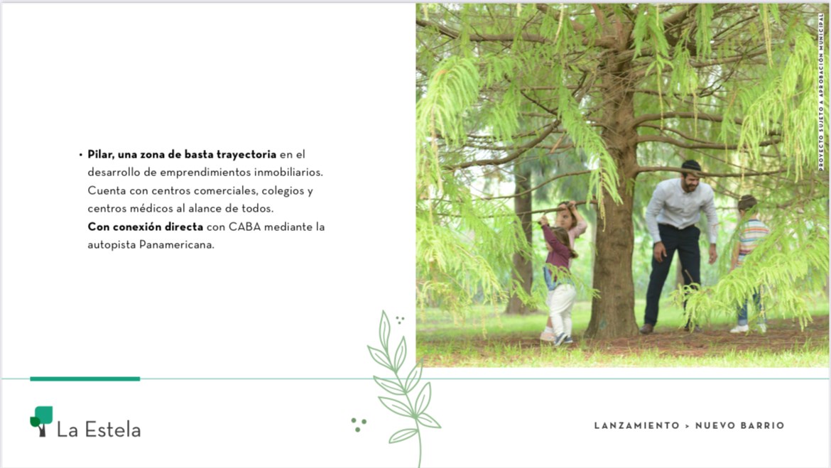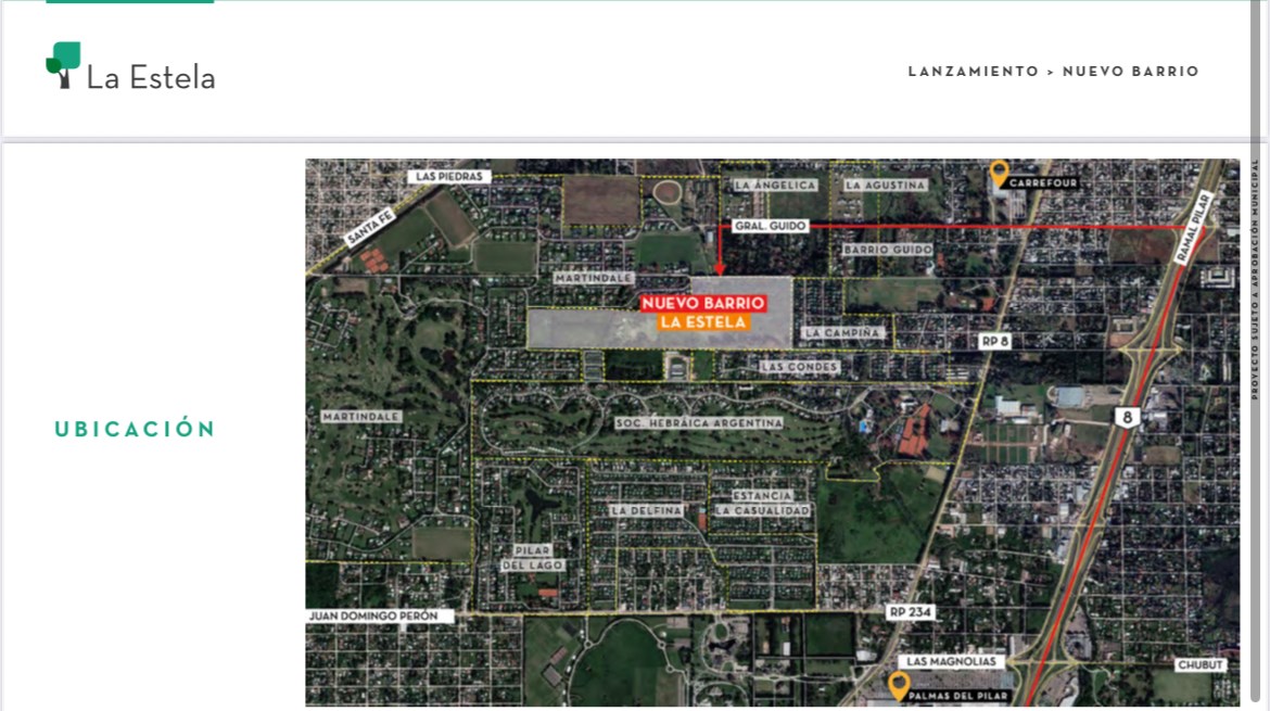 Ubicado en una zona consolidada de Pilar, sobre un predio de 33ha con gran arboleda. Excelente ubicación a la altura del km 53 de la Panamericana con buen acceso. A pocos metros de supermercados y centros comerciales. I N F R A E S T R U C T U R A Redes subterráneas de: electricidad, agua, gas y cloaca. Red vial (Asfalto): caminos internos con cordón cuenta. Alumbrado público. Pilares de servicios domiciliarios. Calle exterior asfaltada. Parquización en veredas. Edificio de acceso. SUM. 1 cancha de futbol + 2 de paddle + 2 de tenis.